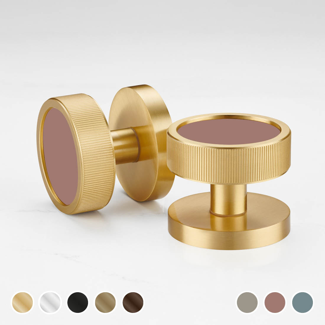 A pair of spring loaded brass linear mortice door knobs with a gloss insert. Available in a three variations of gloss colours.
